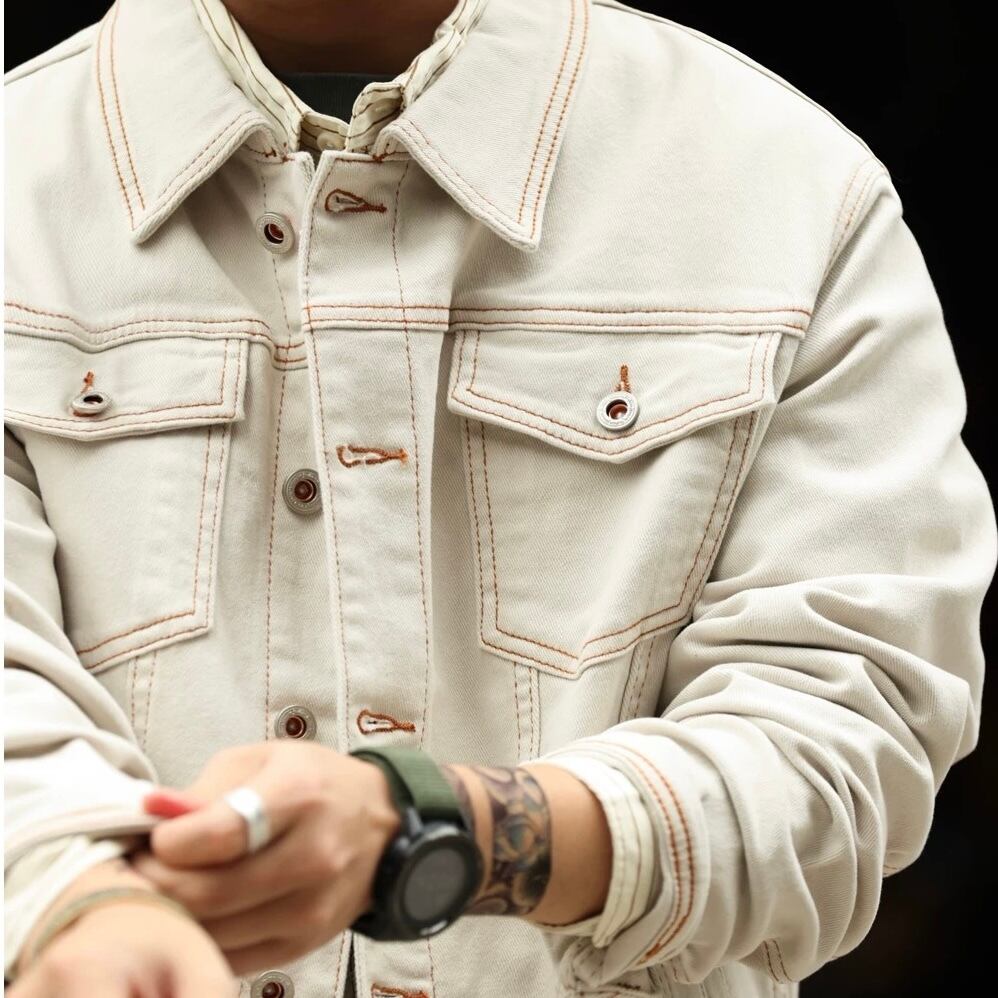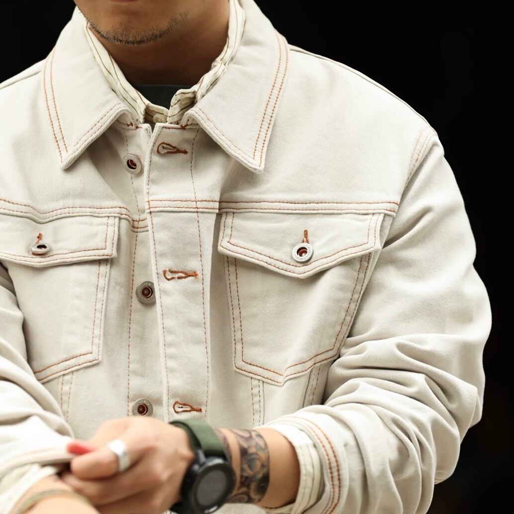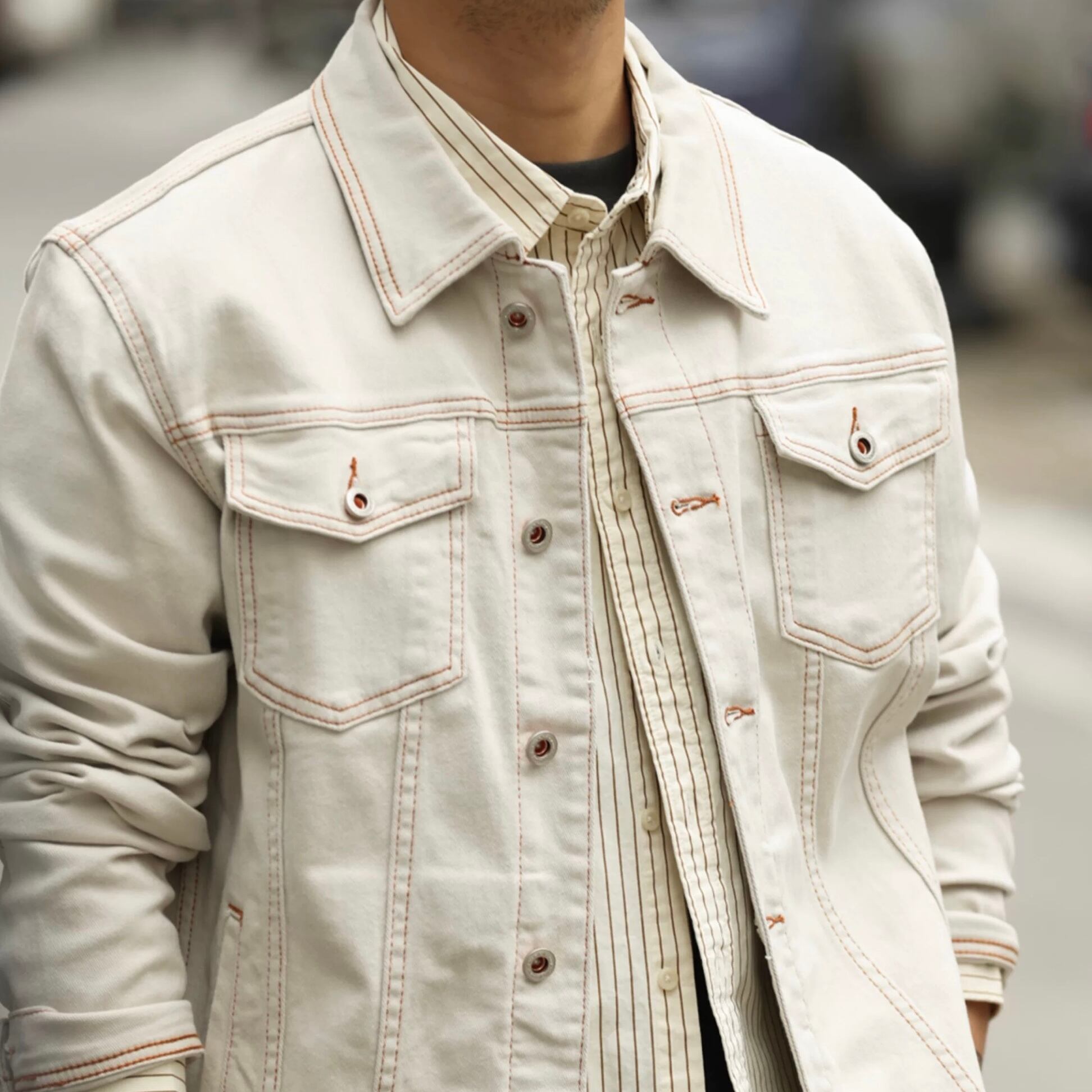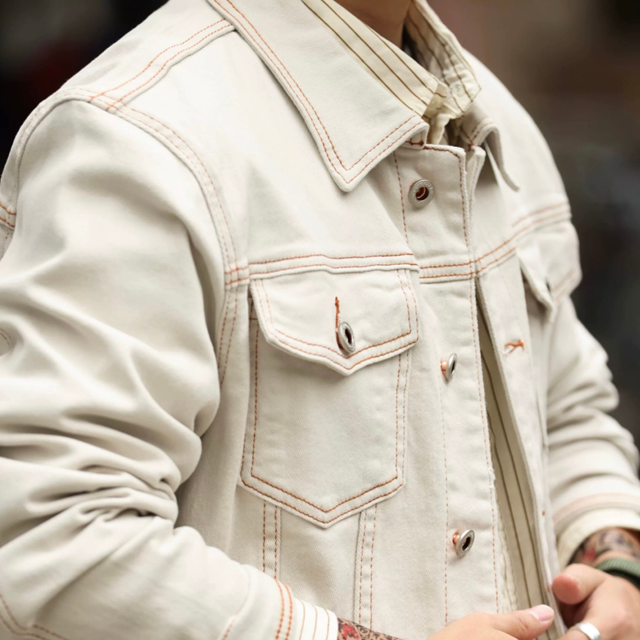カジュアルスタイルに深みを与えるホワイトデニムジャケット。