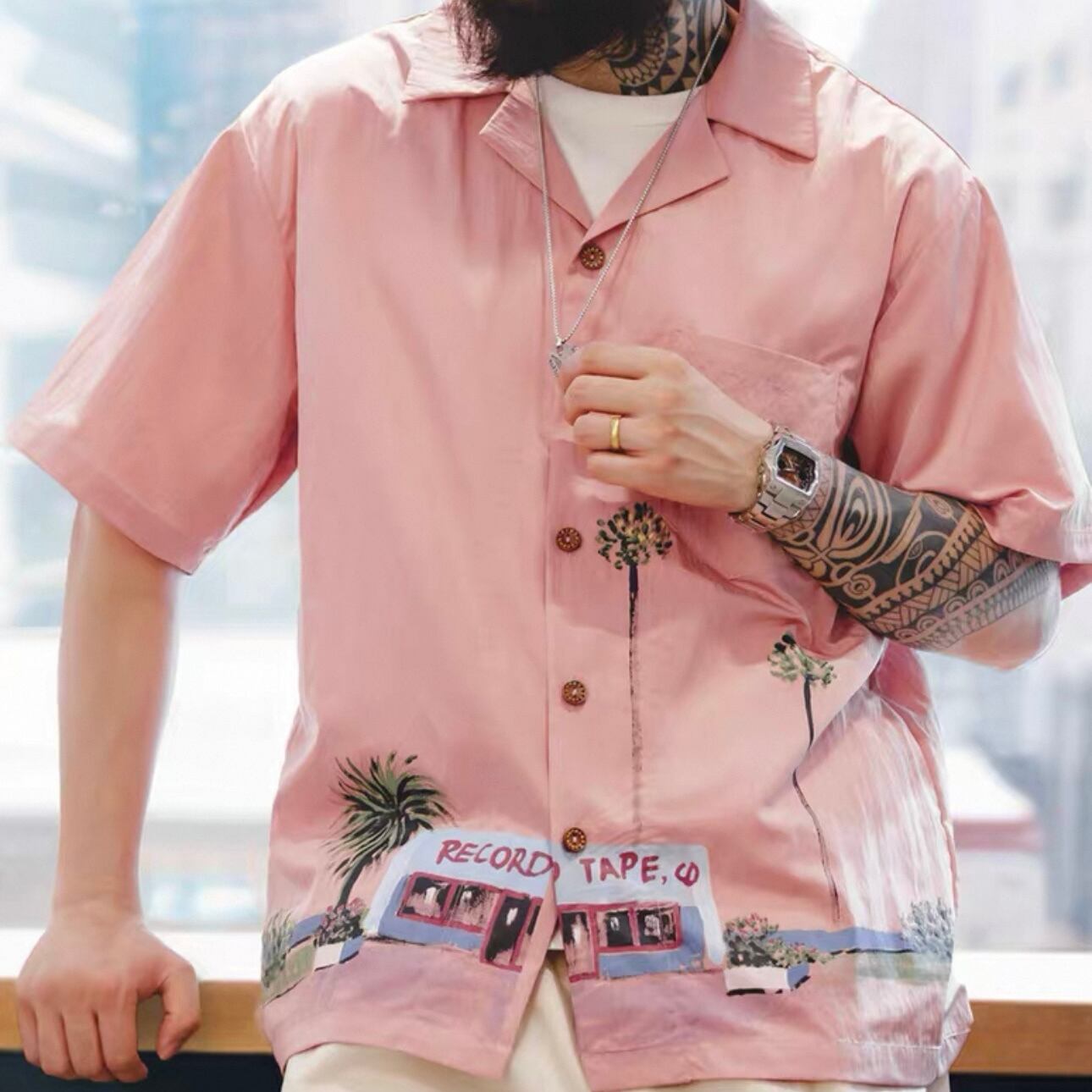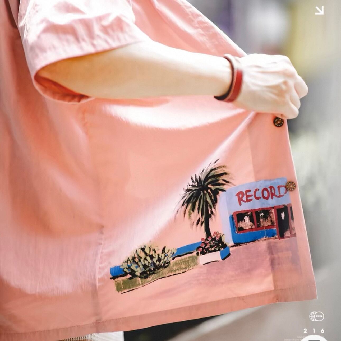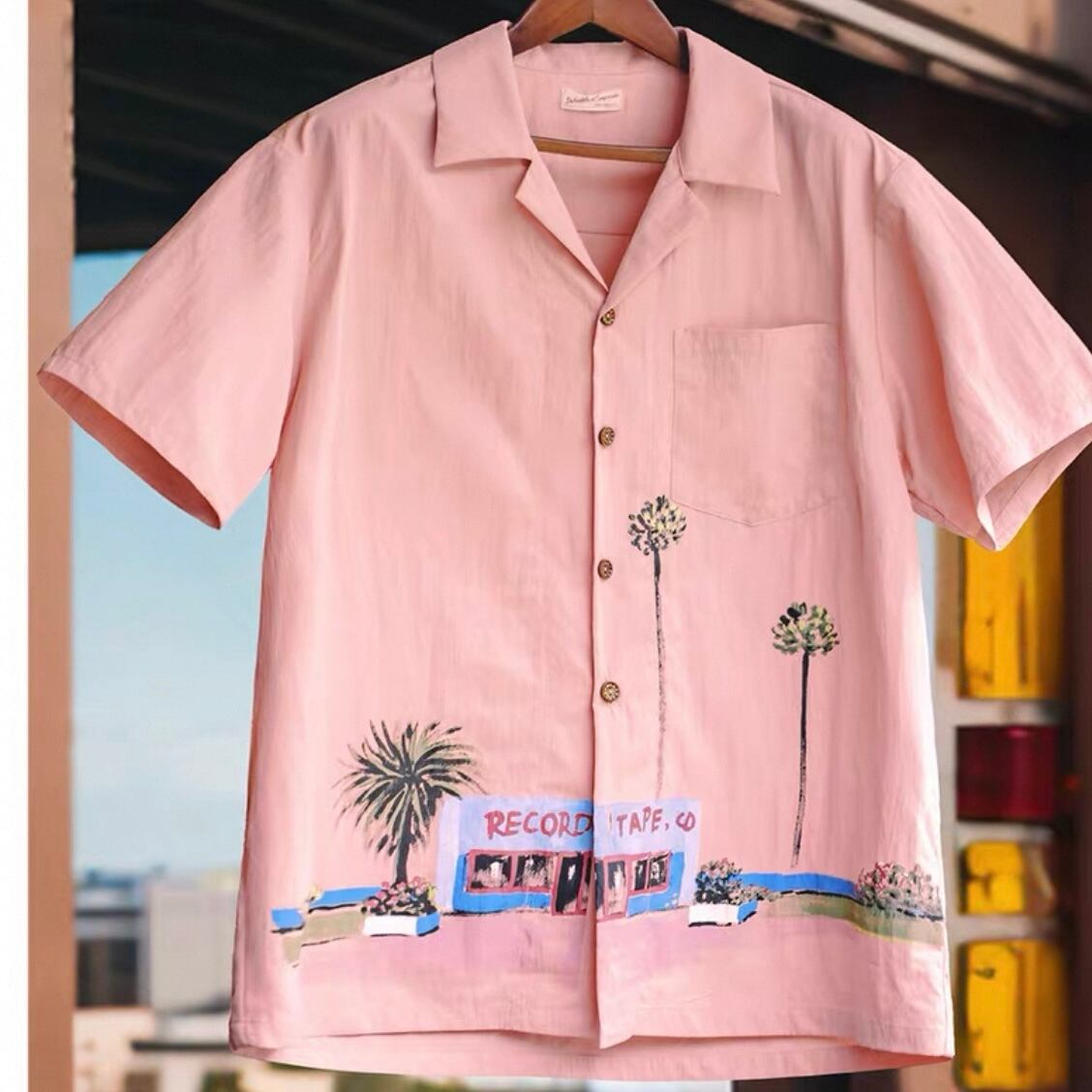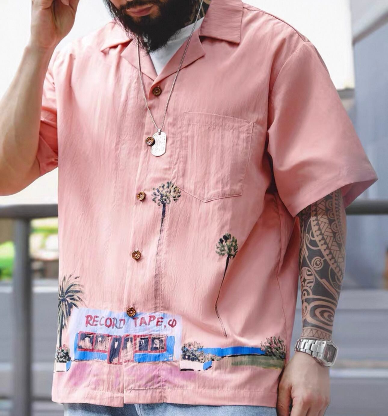 日焼けしたようなビンテージピンクに西海岸の風景を油絵で描いたアートプリントのシャツです。