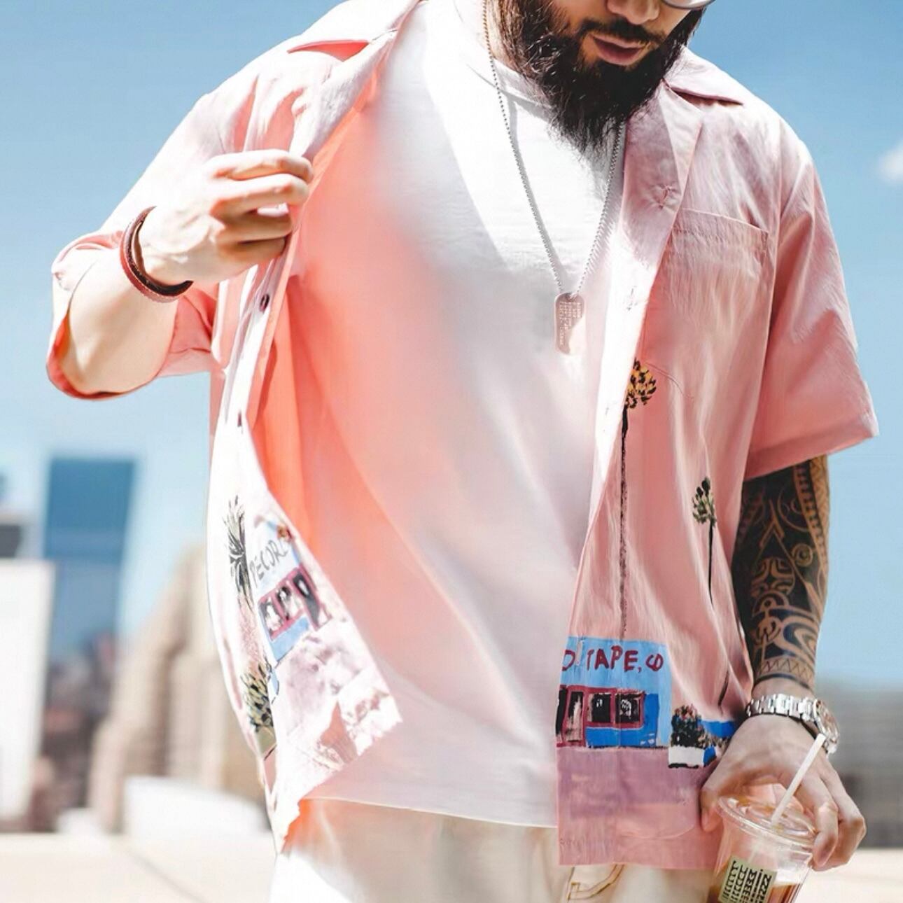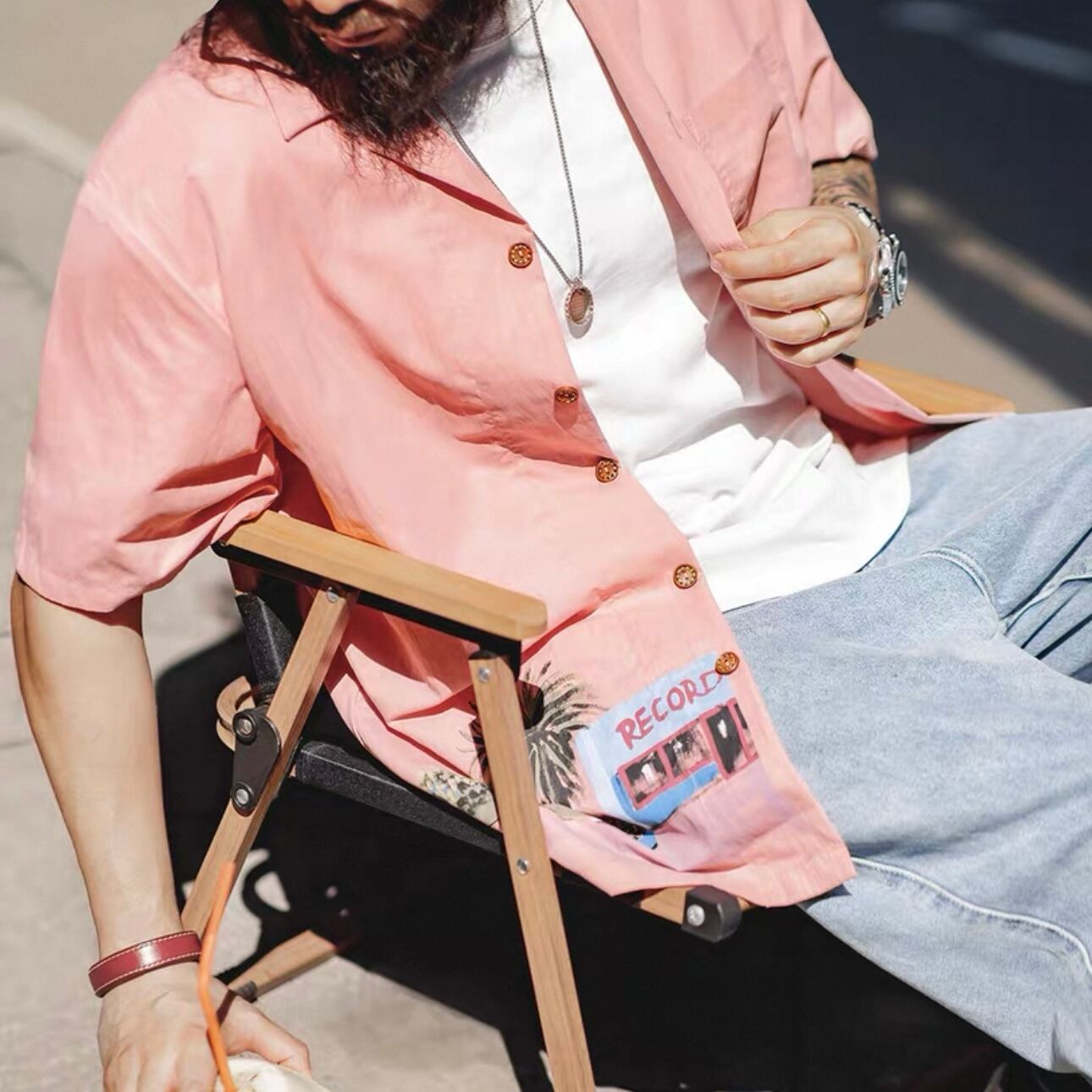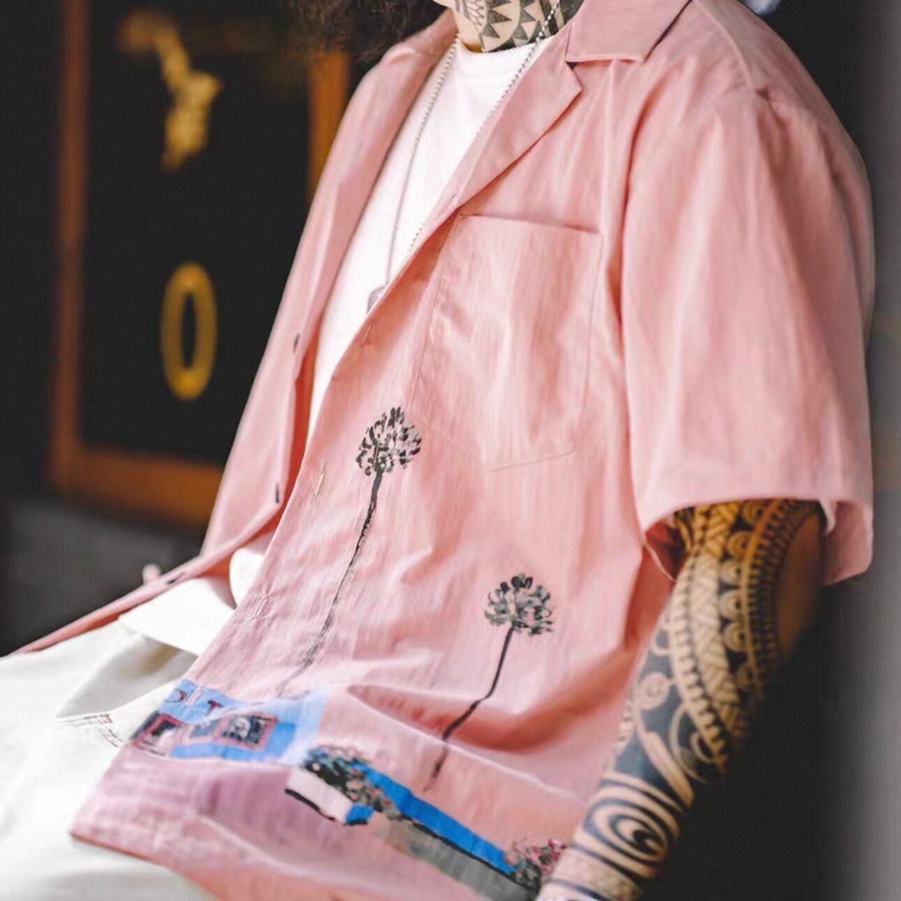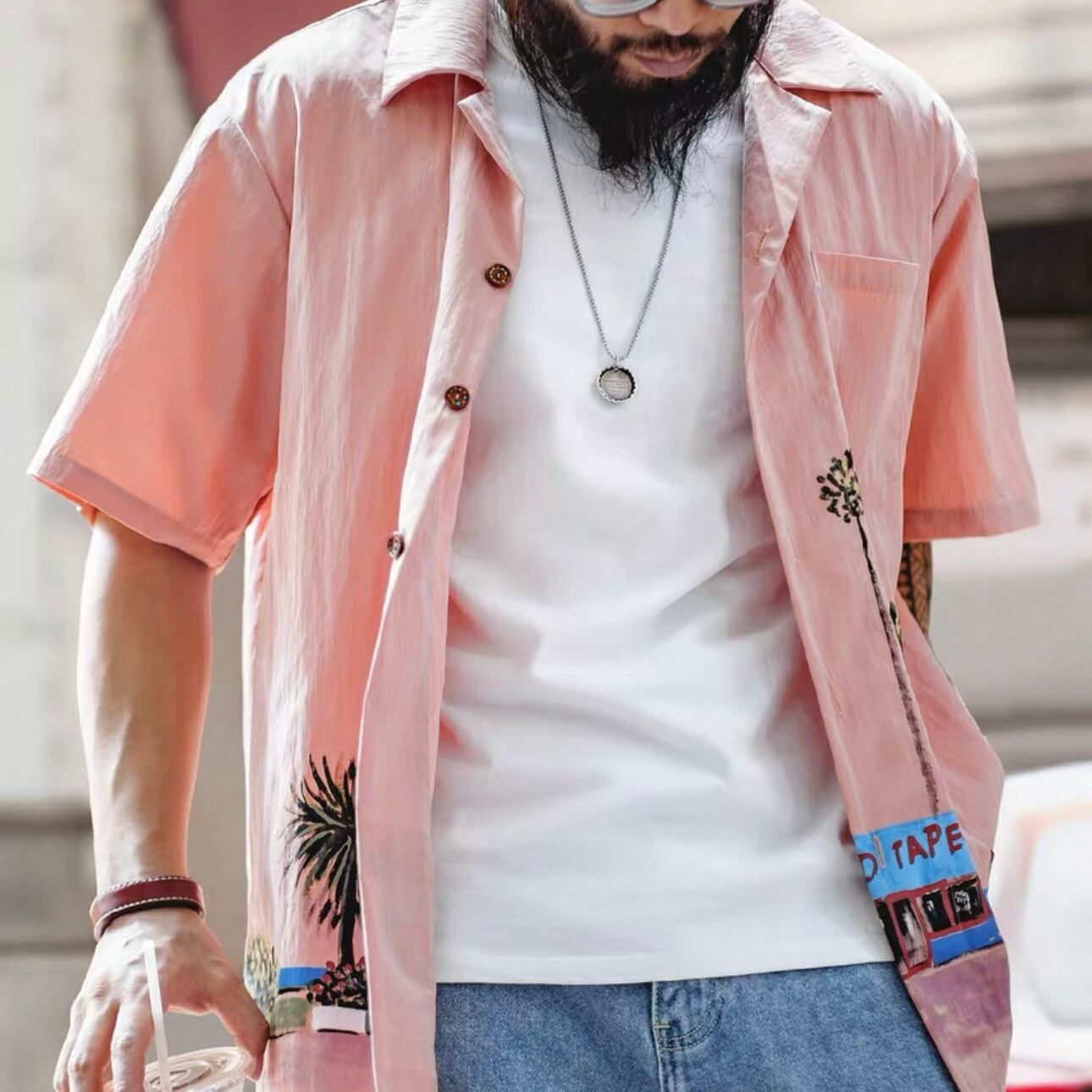 日焼けしたようなビンテージピンクに西海岸の風景を油絵で描いたアートプリントのシャツです。