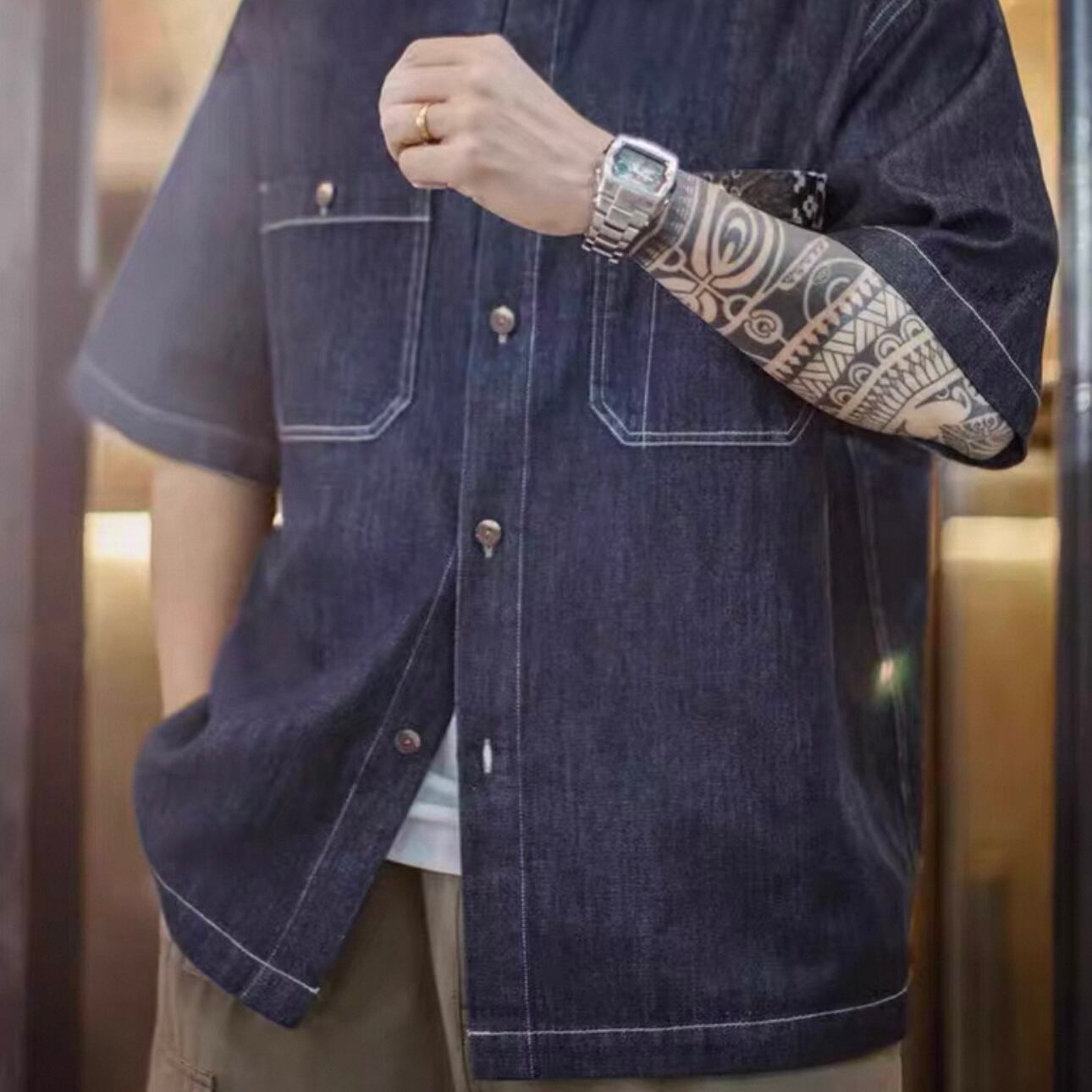 胸ポケット表面に縫い付けており、デニムシャツのポイントにする事で90年代風のレトロなスタイルに。