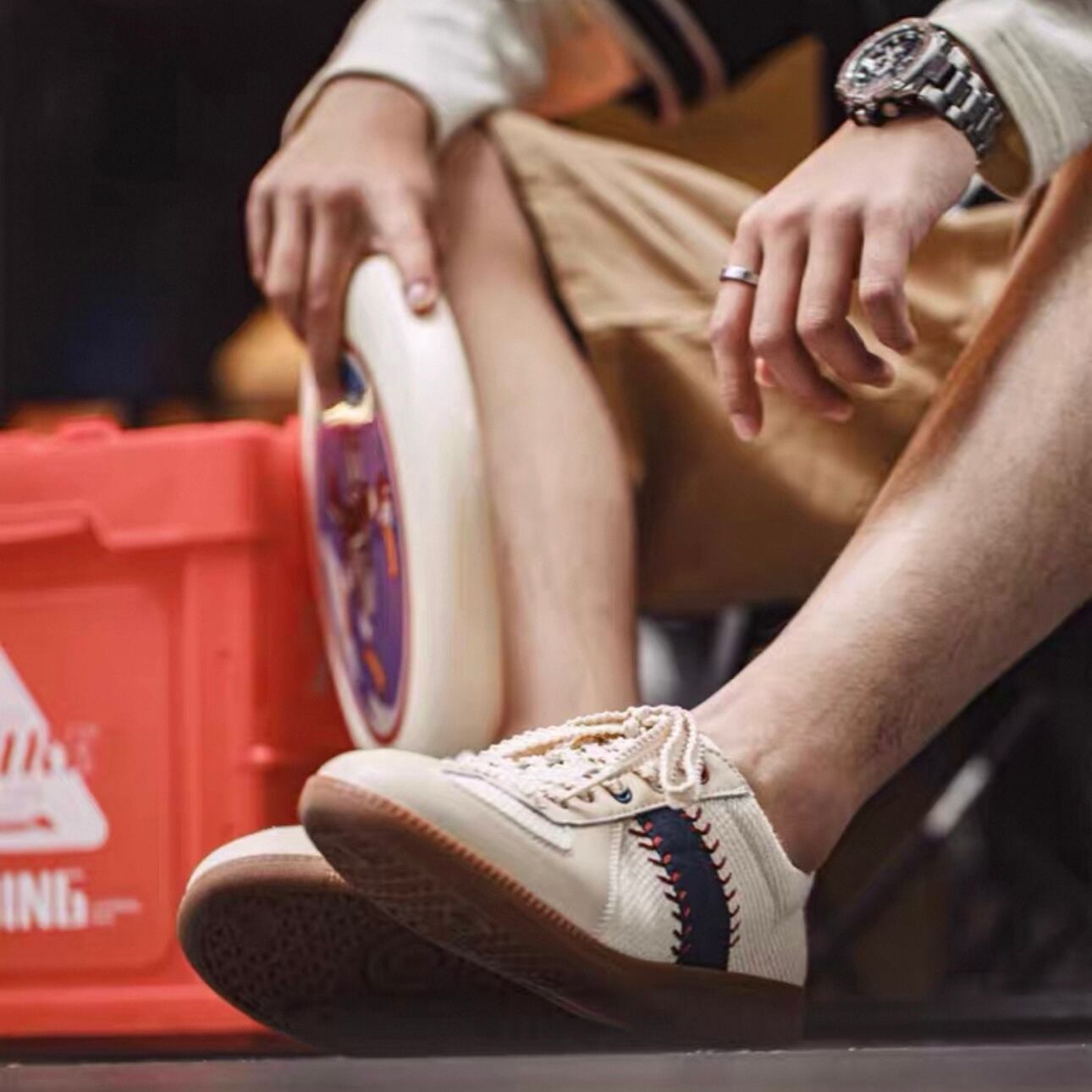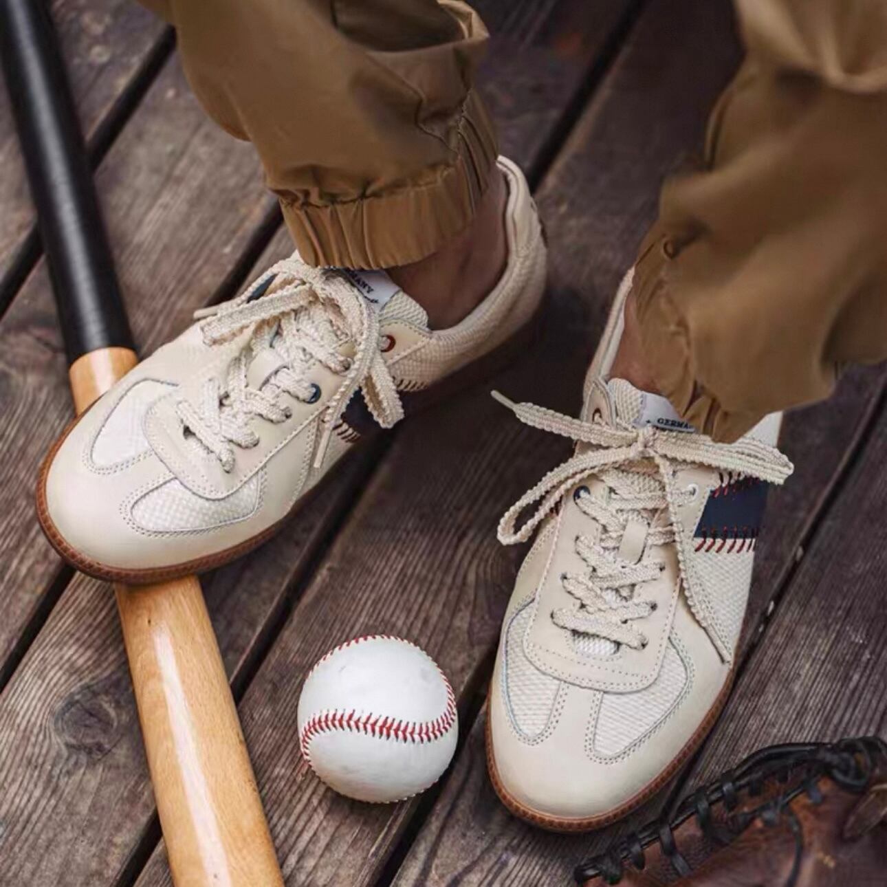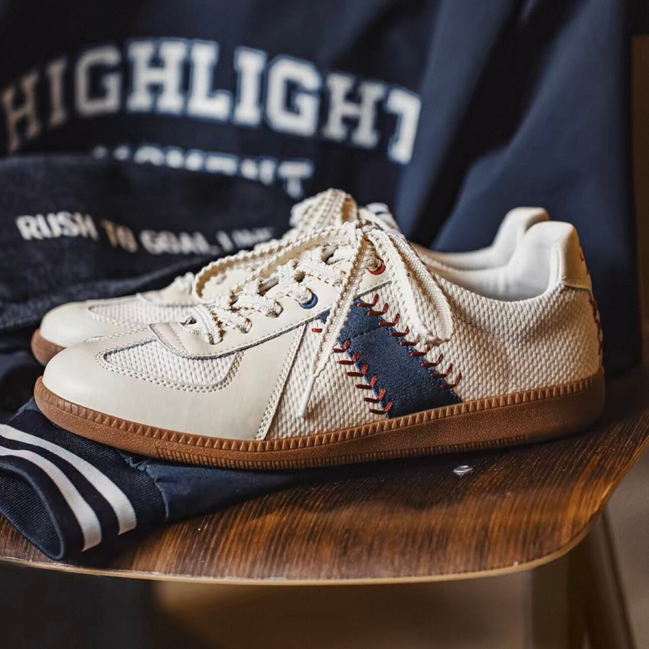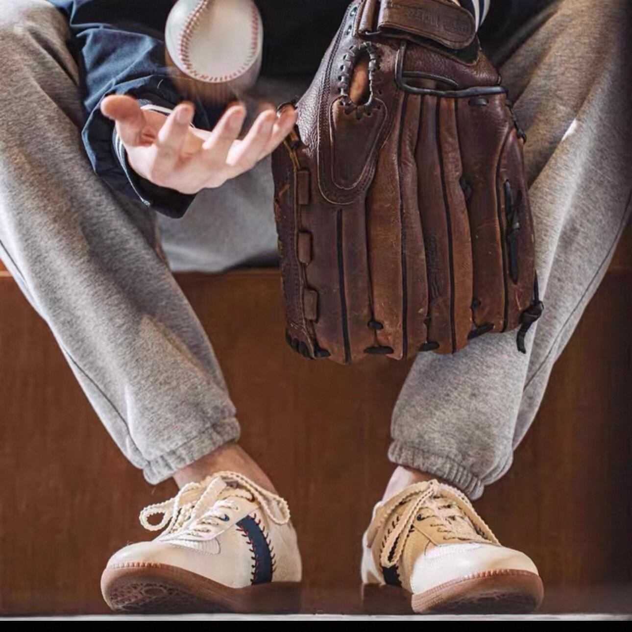 ヴィンテージ感漂うアイボリーにMLBのロゴにも使われるアメリカンカラーを配色し、更には野球ボールと同じステッチデザインのスニーカーです。