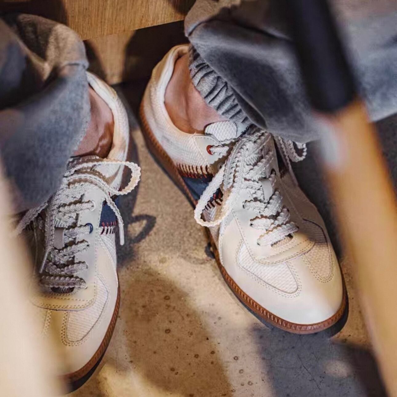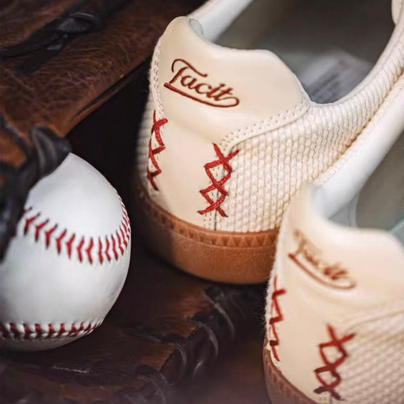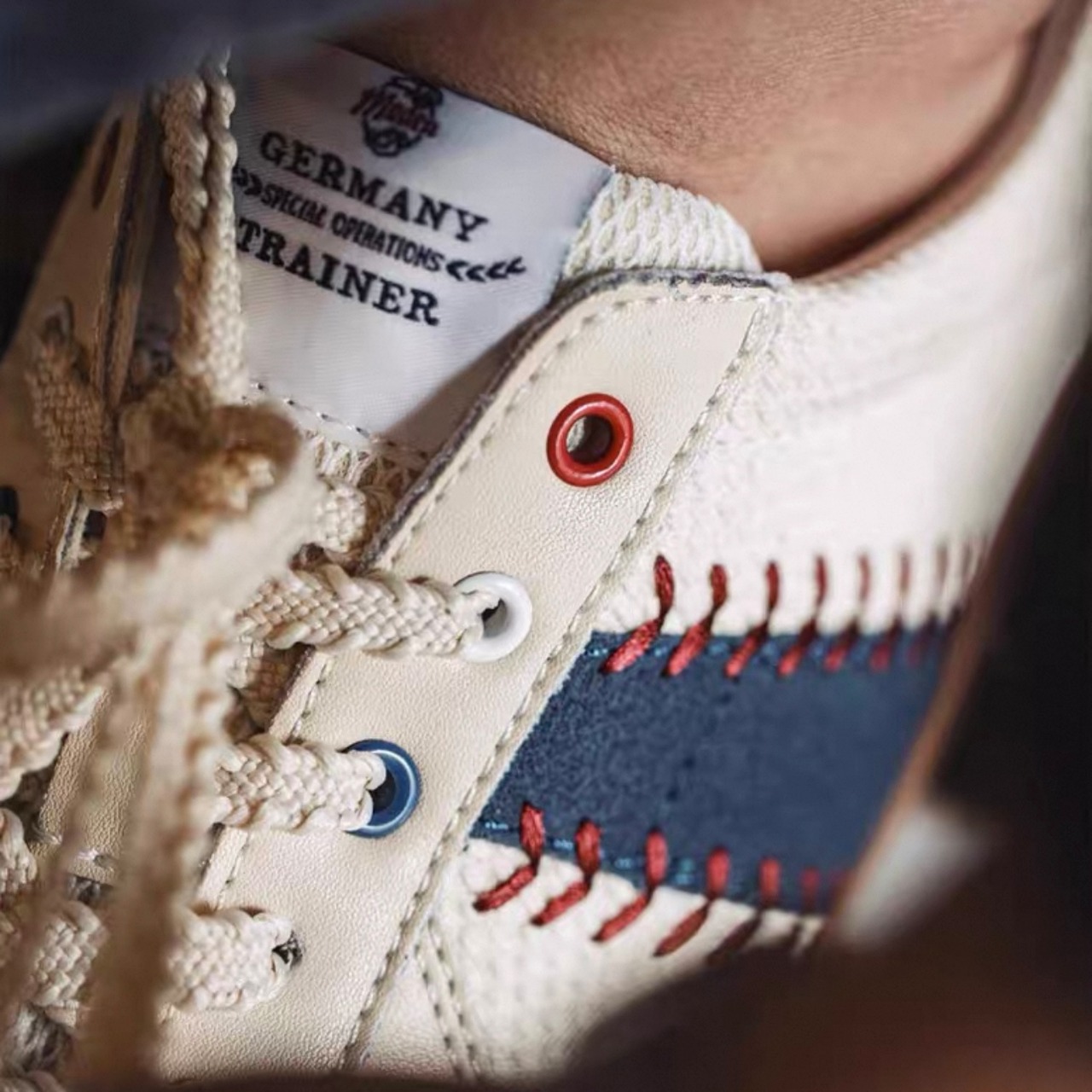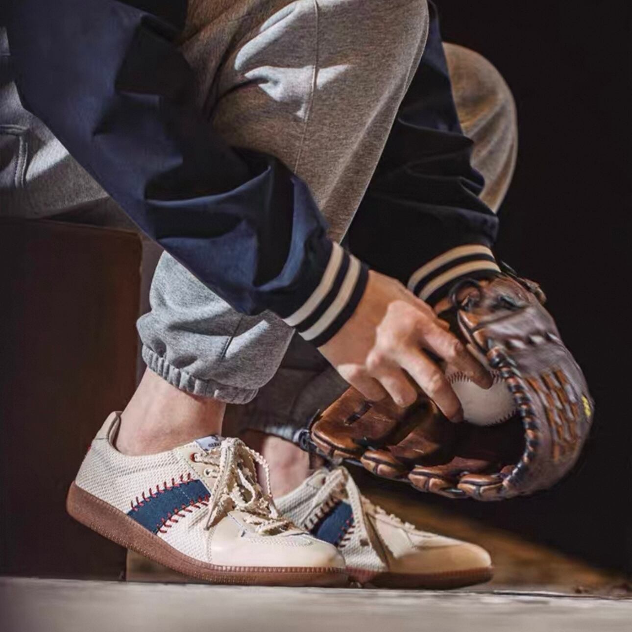 ヴィンテージ感漂うアイボリーにMLBのロゴにも使われるアメリカンカラーを配色し、更には野球ボールと同じステッチデザインのスニーカーです。